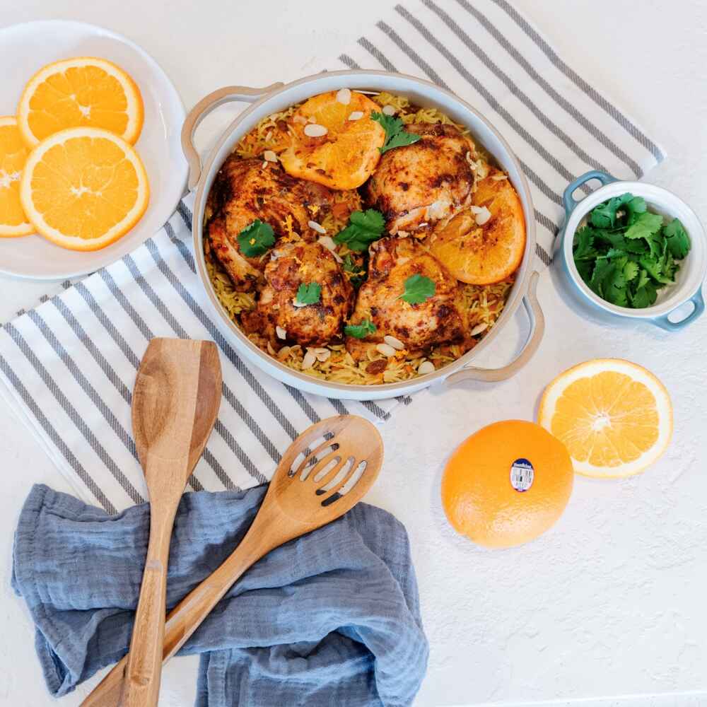 - 將雞肉連焗盤上碟,最後灑上芫荽葉、剩餘杏仁片及橙皮作裝飾即可。