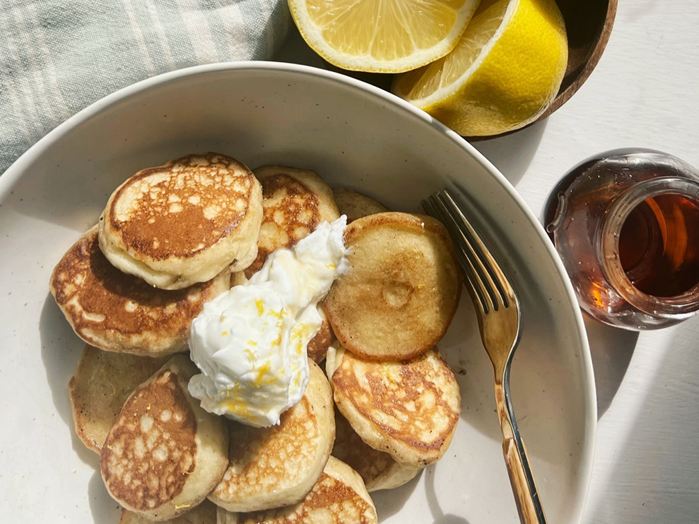 4. 將班戟放入碗中,加入希臘乳酪、檸檬汁及檸檬皮碎,即可享用。